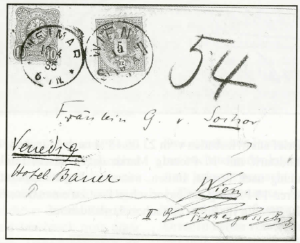 Abb. 3 Brief von Weimar am 12.04.1885 nach Wien, frankiert mit 10 Pfennig Marke (begünstigter Tarif nach Österreich). In Wien am 14.04 nachgesandt nach Venedig.