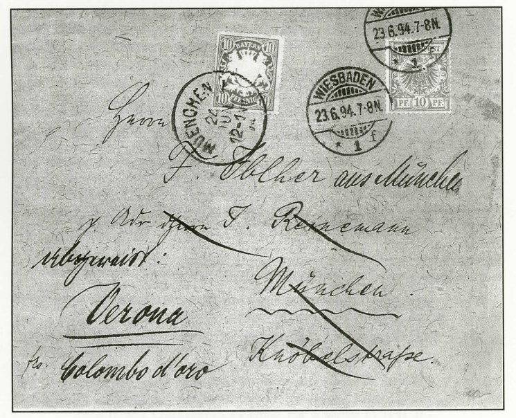 Abb. 4, Brief aus Wiesbaden vom 23.06.1894 nach München, frankiert zum Inlandstarif mit 10 Pfennig Marke der Deutschen Reichspost. Nachsendung nach Verona, Italien, mit einer Ergänzungsfrankierung von weiteren 10 Pfennig der bayerischen Post zu einer Gesamtfrankatur von 20 Pfennig für einen einfachen Auslandsbrief.