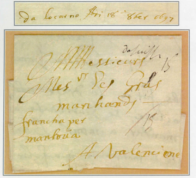 Am 18. Oktober 1697 schrieb Ciacomo Gancino aus Locarno ein geschäftlicher Brief (4 Gramm) nach Valenciene (Valenciennes). Mit der Übergabe des Briefes an den Boten nach Italien begann die postalische Reise. Der Botenlohn bis Mantua zahlte Gancino bar, was er bereits mit „francha per mantoua" auf dem Brief vermerkte.