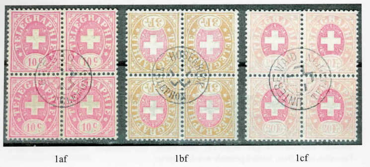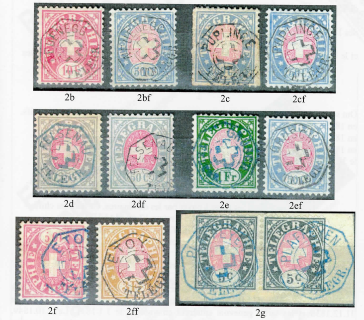Nun kommen wir zu den Telegraphen-Stempeln, welche im Nachlass von Auberson gefunden wurden. Die Hauptschwierigkeit besteht darin, die sicher echten aus der APeriode zu finden, um passende Paare zeigen zu können. Diese Stempel sind rar, da diese Stempeltype nur in kleinen sogenannten „III. Klasse Landstellen" verwendet wurden. Links ist jeweils die Abstempelung, welche ich als echt während der Verwendungszeit gebraucht erachte (2a-2f) und rechts die nachträglich gestempelten (2af-2ff), vorwiegend aufgrund der kleinen konstanten Fehlstellen und anderen Einzelheiten im Vergleich mit den anlässlich der Rückgabe im März 1957 angefertigten Abbildungen dieser 153 Stempel. Daraus ist beim Vergleich ein gewisses Muster der Verfälschten erkennbar. Auch ist das Fehlen der Fr 1.- und 20.- Werte zu beachten.