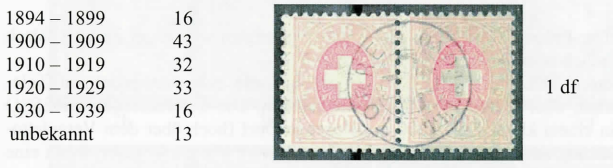 Die 20 Fr Wertstufe auf Faserpapier ist gestempelt selten, weil diese erst Ende 1885 verausgabt und daher kaum ein Jahr lang verwendet werden konnte. Die Telefonstation in TORRE (Idf) war von 1883 bis 1907 geöffnet und verwendete sicher keine 20 Fr Werte! Diese fünf Telefonstempel wurden übrigens im Nachlass von Auberson gefunden, der in seiner Veröffentlichung (1950) behauptet, dass er von 1910-1950 rund 800 verschiedene Stempel auf Telegraphenmarken gefunden hätte, von denen er rund die Hälfte als Unikate einstufte. Ich vermute, dass diese fünf Telefonstempel dabei mitgezählt wurden.