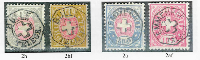 Wir können nur versuchen, die während der Verwendungszeit echt gestempelten (A) und die nachträglich verwendeten (B-E) zu unterscheiden. Kleine Fehlstellen in den Stempeleinfassungs-Linien helfen teilweise ein Urteil zu bilden. Wie erwähnt kennen wir den Erhaltungszustand der meisten Stempel bei Rückerhalt in Bern (zwischen B und C) sowie den Zustand bei Rückgabe aus dem Nachlass von Auberson im Frühling 1957 (zwischen D und E). Auch die Stempelfarben sollen beachtet werden. Bei der A-Periode sind diese sehr unterschiedlich und kommen auch in blau vor wie Beispiel 2g. Die späteren Verwendungen sind entweder trocken grauschwarz (siehe Abbildung laf-ldf) oder in einem klaren (nicht öligem) tiefschwarz (wie 2af-2ff), siehe nächste Seiten.