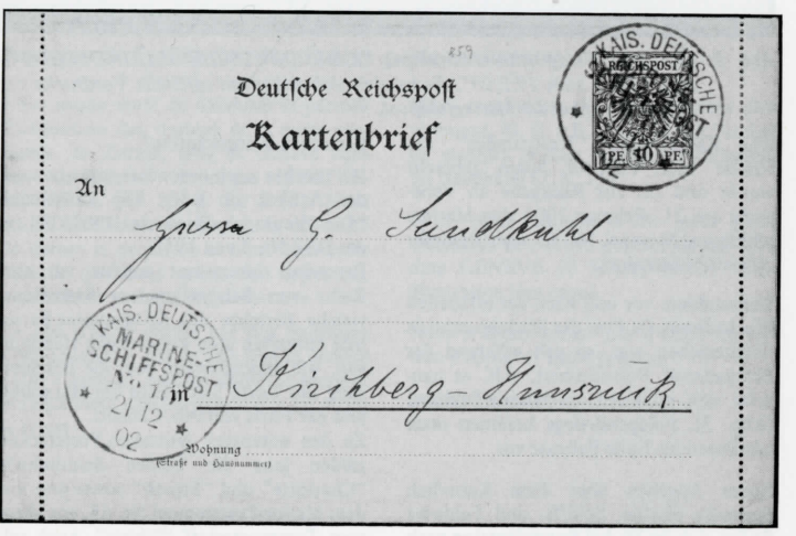Abb. 2: Kartenbrief (Ganzsache) mit Stempel "KAIS. DEUTSCHE MARINE-SCHIFFSPOST No 10, 21 12 02". Wohl bestand bereits ab 20.12.02 Portofreiheit; die Verfügung traf aber nicht früh genug bei allen Schiffen ein. Deshalb gibt es auch Feldpoststempel noch nach dem 21.2.03.