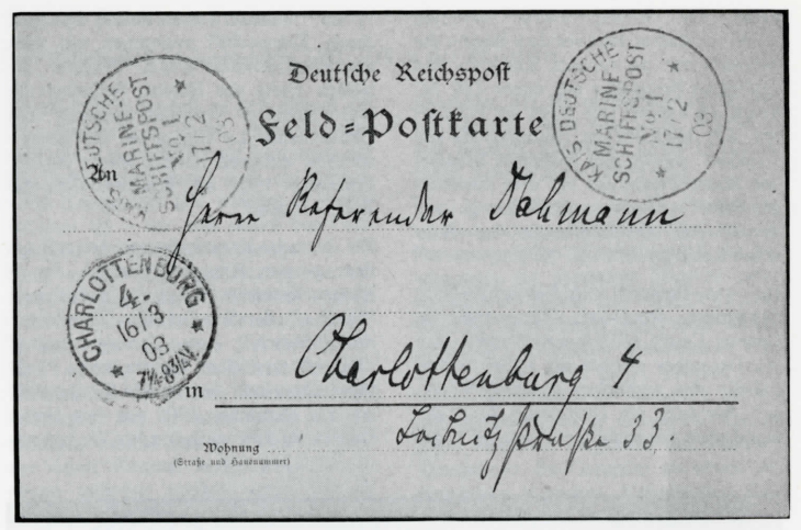 .Abb. 5: portofreie Feldpostkarte. Stempel "KAIS. DEUTSCHE MARINE-SCHIFFSPOST No l vom 17.2.03". Es handelt sich dabei um offizielle Vordrucke zur Verwendung bei der Marinefeldpost.