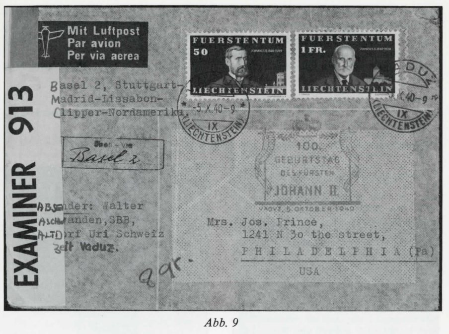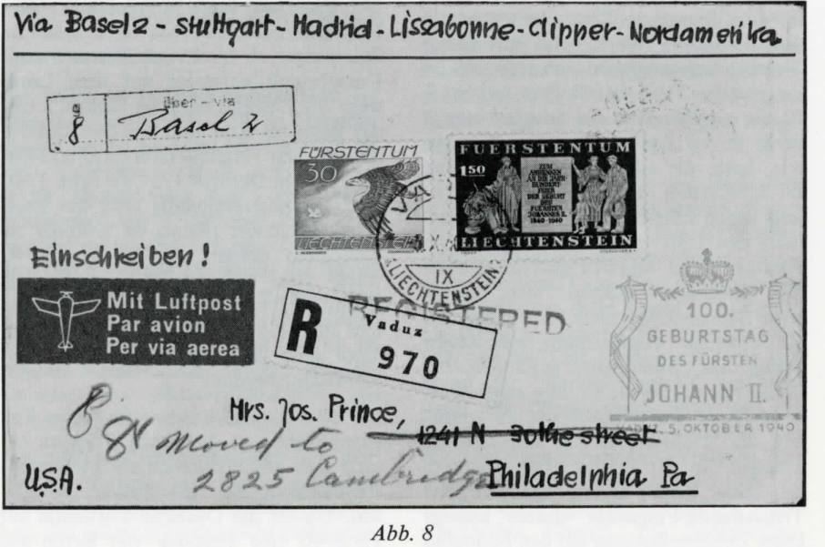Abb. 8 zeigt einen eingeschriebenen Brief, der am 5. Oktober 1940 in Vaduz mit genauer Leitvorschrift für die Luftpostbeförderung aufgegeben worden ist. Die Route führte mit der Bahn via Leitpostamt Basel 2 nach Stuttgart, von dort mit der Lufthansa nach Madrid, weiter entweder mit der Bahn oder der spanischen Iberia nach Lissabon und ab dort mit PAA-Clipper, der ab Juli 1940 laut Flugplanveröffentlichungen dreimal wöchentlich (montags, donnerstags und samstags) über Horta nach New York verkehrte. Die Sendung ist am 20. Oktober 1940 in New York und gemäss Ankunftstempel am 21. Oktober 1940 in Philadelphia eingetroffen. Eine Zensur auf dem Transitweg fand bei diesem Brief weder deutscher- noch englischerseits statt.
