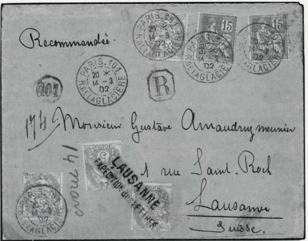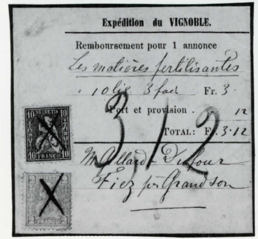 Vers 1890 les PTT mettent en Service un timbre muet special. II s'agit d'un cachet en bois double cercle, pour uniformiser le mode de faire. L'usure et la fragilite de ce timbre provoquent souvent des obliterations mal venues, soit incompletent ou que seul un cercle soit apparent (Fig. 16).