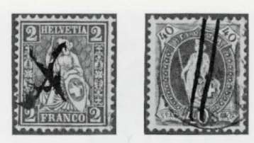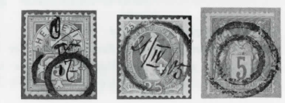 L'on rencontre beaucoup de timbres isoles helvetias debouts et croix et chiffres annules de cette maniere, les lettres et cartes etant moins communs. Des 1908 ce sont surtout les correspondances de l'etranger qui sont annulees, l'emploi pour la Suisse diminuant serieusement. Le dernier emploi connu est de 1972.