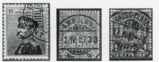 c) Annulation soit par une croix ou des traits de plume, sur des timbres non obliteres ou mal obliteres (Fig. 14 et 15).
