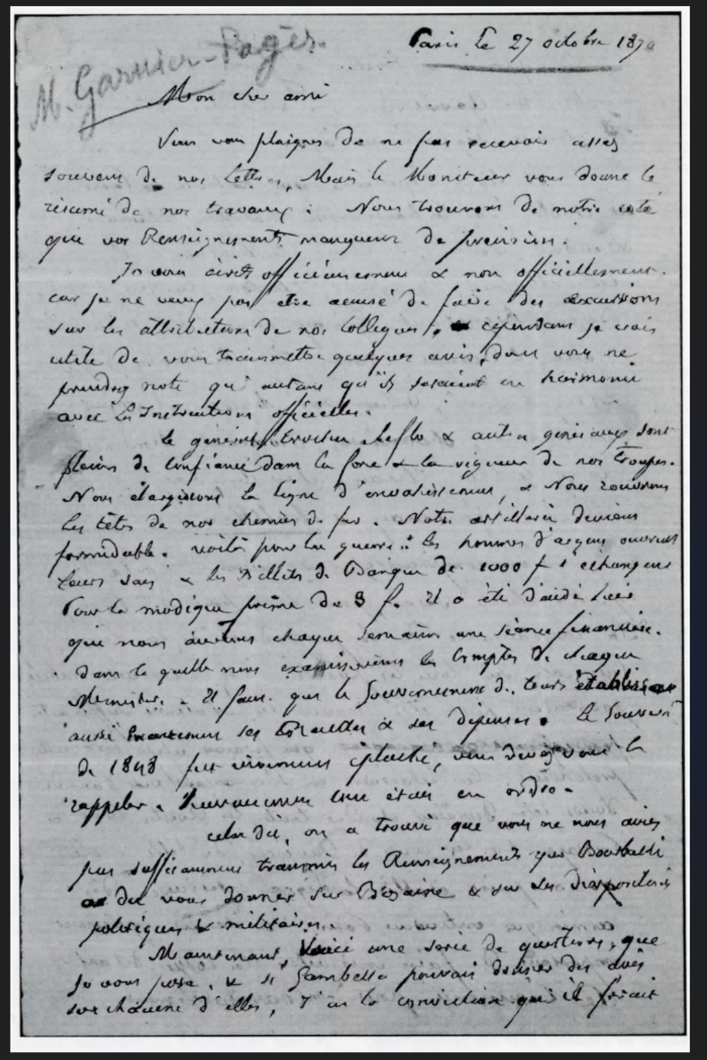 Dieser Brief wurde nach den Unruhen vom 31. Oktober geschrieben und anscheinend mit dem Ballon "Le Galilee" am 4. November erbeutet. Er datiert also etwa eine Woche nach dem hier zitierten Schreiben von Garnier-Pages.