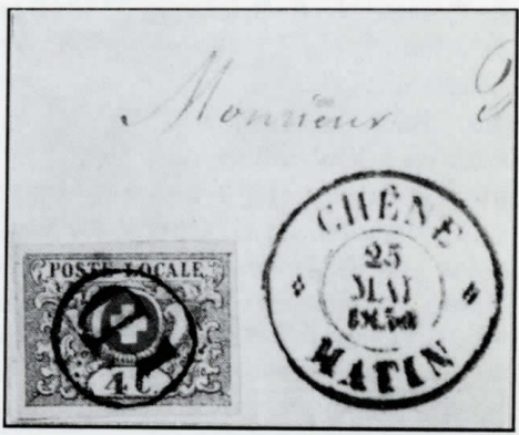 Das Genfer "Eichen"-Dorf, Heimatort von Louis Favre, dem Erbauer des Gotthardtunnels, hatte schon seit 1815 einen Poststempel CHESNE, welcher eine Postablage vermuten lässt. Chesne-Stempel sind jedoch nur bis 1830 bekannt. Wahrscheinlich wurde diese Postablage später aufgehoben, um in der "philatelistischen" Zeit als Postbureau eröffnet zu werden. Am 1. Dez. 1849 ernannte der Bundesrat Louis Grenier jun. mit einer Jahresbesoldung von 250 Fr zum Posthalter von Chene (Bundesblatt 1849/53, 1852/16). Chene bestand 1850 aus den 2 politischen Gemeinden Chene-Thonex und Chene Bourg, später aus den Gemeinden Chene Bougeries und Chene-Bourg, und hatte 1860 fast 3000 Einwohner in ca. 390 Wohnhäusern. Diese Poststelle hatte bis Herbst 1854 drei verschiedene Poststempel: Ortsstempel Zweikreis mit vierstelliger Jahreszahl und Angabe Matin und Soir (Nr. 6037), ferner PD-Stempel im Kreis und ab 1851 auch Rautenstempel.