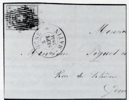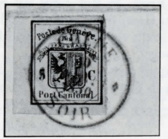 Colliard in Chene-Thonex. Doch ist auch ein Brief von Chene mit blauem PD im Kreis und blauem Ortsstempel als Waadt4-Beleg vom 20. Jan. 1850 vorhanden. Ferner ist ein Brief vom 21. Juni 1850 mit vollem Ortsstempel auf einer Waadt 5 bekannt an den Pasteur Jaquet in Genf, wobei nicht an das heute aufgehobene Gefängnis St. Antoine zu denken ist, sondern an die gleichnamige Promenade. Verauktioniert wurde auch eine lose Waadt 5 mit einem kaum entzifferbaren Ortsstempel. Vorsicht aber vor einem Chene-Briefstück mit einer Waadt 5 vom 7. April 1850 (Sonntag). Gewarnt sei auch vor den Falschstempeln von Fournier mit zwei- und vierstelligen Jahreszahlen: 3.3. 50, 28.5.1851 oder abgeänderten Daten. Die von Fournier "fabrizierten" Chene Stempel weisen MATIN, nie SOIR aus.
