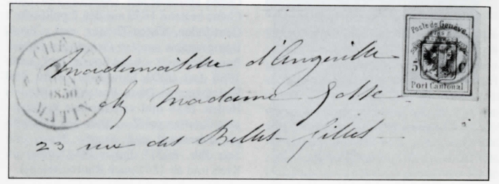 Genfer Kantonal- oder Genfer Kreispostmarken mit vollem Ortsstempel Chene Nr. 6037 sind grösste Raritäten. Untenstehend ein Genfer Ausschnitt mit diesem Stempel vom 20. Febr. 1850 (Fehllesung?: 20. Jan.?) auf einem Brief an
