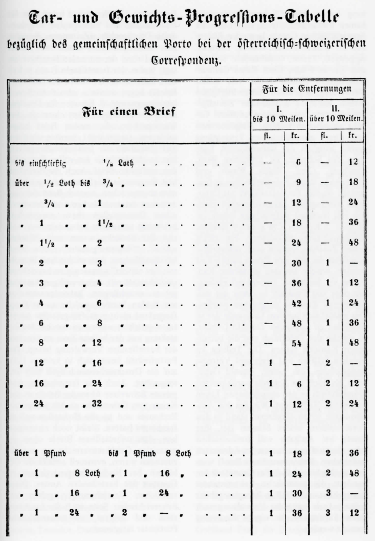 Sehen wir uns nun den Abschnitt II näher an, so können wir dort zunächst das grundlegende Gemeinschaftsporto nachlesen, welches mit 6 Kreuzern CM (Wiener Währung) für Briefe festgelegt worden war, die zwischen Postorten bis maximal 10 Meilen Entfernung gewechselt wurden, beziehungsweise mit 12 Kreuzern CM für Postwege über 10 Meilen Entfernung (Abb.). Diese Grundtaxe verstand sich für Briefe im Gewicht bis zu einem halben Loth, während für schwerere Briefe steigende Taxen laut auf Seite 21 abgebildeter Tabelle massgebend waren. Die Meilenmessung erfolgte in gerader Linie unter Ausserachtlassung der Staatsgrenzen vom Aufgabe- zum Zielort; hiezu hatte es die k.k. Oberste Hofpostverwaltung übernommen, eine Tabelle jener Postorte beider Staaten zu erarbeiten, zwischen welchen das niedrigere 6 Kreuzer-Porto Geltung haben sollte. Schweizerischerseits kamen hiefür Postorte in den nahe der österreichischen Grenze liegenden Kantonen St. Gallen, Zürich, Glarus, Thurgau, Appenzell, Tessin, Graubünden, Schwyz und Uri in Frage.