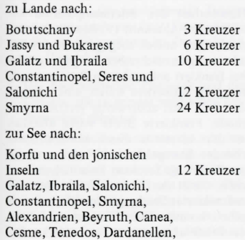 Im Abschnitt III, der sich mit "transitirender Correspondenz" befasst, ist vorweg interessant, dass Österreich passierende Post nach, beziehungsweise von, den Donaufürstentümern und anderen Teilen des osmanischen Reiches voll frankiert, unfrankiert und auch teilweise frankiert (z.B. bis zur schweizerischen Grenze bei Absender in der Eidgenossenschaft) zulässig war. Diesbezüglich privilegierte Plätze waren Bukarest, Jassy, Botutschany, Galatz, Ibraila, Seres, Salonichi, Constantinopel, Smyrna, Alexandrien, Beyruth, Canea, Cesme, Tenedos, Dardanellen, Gallipoli, Larnaca, Rhodos, Samsun, Tultscha, Varna, Trapezunt sowie Korfu mit den übrigen jonischen Inseln; durchwegs also im Wege österreichischen Auslandpostwesens erreichbar gewesen. Briefe aus der Schweiz nach anderen Orten der Donaufürstentümer oder des osmanischen Reiches mussten bis zu einem der vorstehenden Postorte — dem geographisch für die Weiterleitung massgeblichen Platz - voll freigemacht sein; die Weiterleitung und Resttaxierung oblag dann den dortigen Posteinrichtungen. Die zusätzlichen Taxen für Briefe bis zu einem halben Loth Gewicht nach diesen Plätzen auf fremdem Staatsgebiet verstanden sich wie folgt: