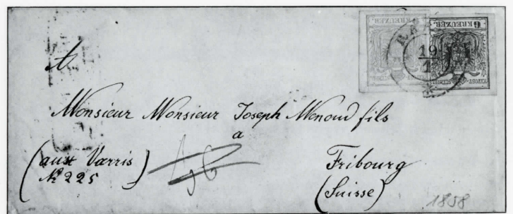 Abb. 1: 15 Kreuzer-Frankatur auf Brief von Raab nach Fribourg mit 9 Kreuzer Osten, und 6 Kreuzer (20 Rappen) Schweiz. Portoanteil vom 19. Jänner 1858.