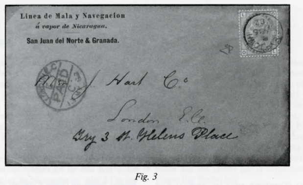 La figure 3 presente precisement une enveloppe ä en-tete de cette compagnie, partie probablement de Granada pourLondres, et affranchie par le bureau anglais de Greytown.