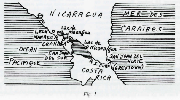 Le Nicaragua, ce petit pays de l'Amerique centrale actuellement si violemment secoue par des lüttes intestines, possede des voies navigables extremement importantes, qui permettent de traverser presque tout le pays par bateau. Ce sont d'abord deux lacs: le lac de Managua (1134 Km2), et celui de Nicaragua (8400 Km2), qui sont relies entre eux. (A titre de comparaison, rappelons que la superficie du lac Leman est de 582 Km2). De plus, le lac de Nicaragua est relie ä l'ocean Atiantique par le Rio San Juan, d'une longueur de 230 Km., et qui est navigable sur tout son cours (voir carte Fig. 1).