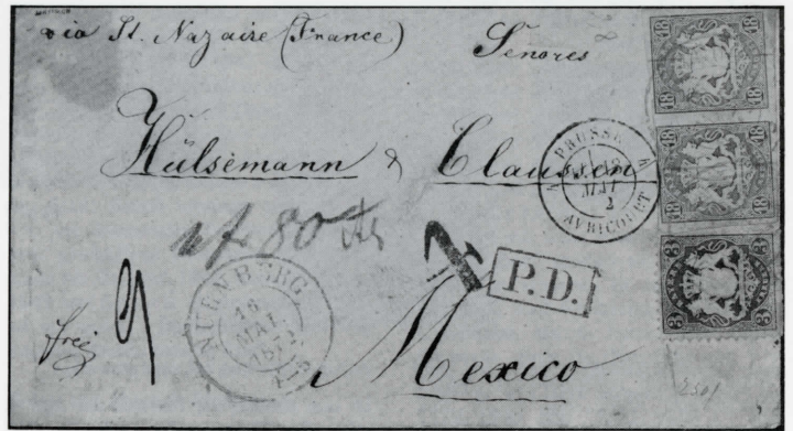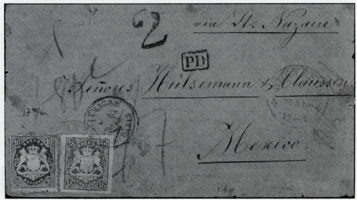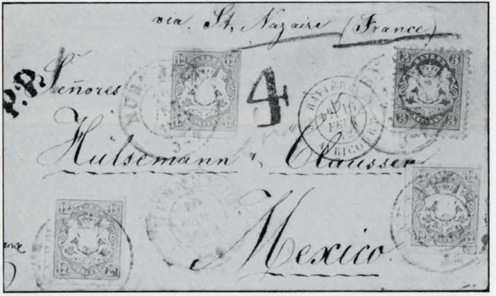 Wir kommen nun zu den Briefen nach MEXICO, wovon wir in der Sammlung 4 Briefe haben, von denen 2 in Abb. 10 und 11 wiedergegeben sind. Die Briefe sind aus der bekannten Korrespondenz Hülsemann & Clausen. Abb. 10 zeigt einen Brief aus Nürnberg vom 16. Mai 1872, frankiert mit 2 Marken zu 18 Kr. geschnitten und einer zu 3 Kr. gezähnt. Die "4" war sicher für 4 Reales, die in Mexico
