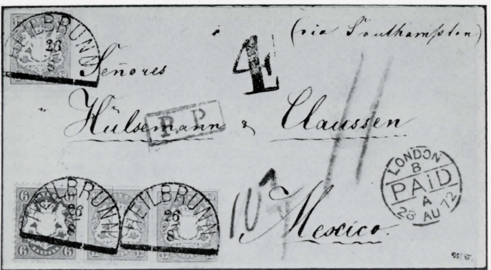 "via St. Nazaire". Der Brief von Abb. 12 stammt aus derselben Korrespondenz. Er wurde am 26. Aug. 1872 in Heilbronn aufgegeben, hatte aber einen anderen Leitweg, nämlich via Southampton. Die Frankatur beträgt 42 Kreuzer. Dieser Brief wurde 1980 bei Corinphila für sFr. 16'OOO zugeschlagen