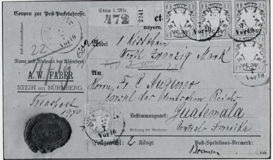 Bleistiftfirma Faber, Stein bei Nürnberg, an den deutschen Konsul in GUATEMALA. Aus den Marken zu schliessen (auf Vorder- und Rückseite befinden sich 19 Ex. Mi Nr. 31 zu l Mark sowie 2 Ex. Mi Nr. 27y zu 18 Kr.) muss die Sendung aus der Zeit zwischen Juli und Dez. 1875 stammen.