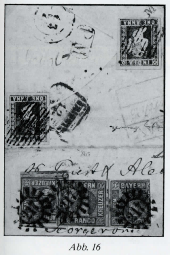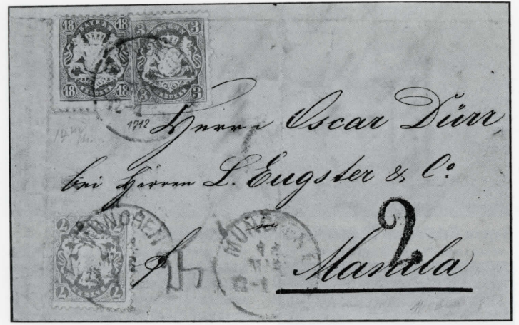 Abschliessend kommen wir noch zu Briefen nach Asien. Abb. 16, leider nur ein Briefstück, ist deshalb bemerkenswert, weil ein Teilweg in indischen Marken (2x l Anna) verrechnet wurde. Als Leitweg ist Triest & Alexandria angegeben. In bayerischen Marken ist 20 Kr. frankiert (18 Kr. gelb und 2x l Kr. rosa), was wahrscheinlich das Porto bis Alexandrien deckte (?). Der Brief Abb. 17 ist nach Manila PHILIPPINEN, seinerzeit spanische Kolonie, adressiert. Die Frankatur beträgt 28 Kr., verklebt mit Marken der gezähnten Wappenausgabe vom Juli 1870. Florian Berger1'gibt 1872 bei Beförderung über Frankreich nach spanisch Ostindien ein Porto von 27 Kreuzern an. Der letzte Brief unserer Zusammenstellung (Abb. 18) ist nach Shanghai CHINA gerichtet, Leitweg «via Brindisi». Die l Mark geschnitten erschien im Aug. 1874 (l Mark = 35 Kreuzer). Die Markwährung (Reichswährung) galt ab 1. Jan. 1876. Die beiden Kreuzermarken (3 und 10 Kr.) stammen von der Ausgabe 1870/73. - Aus dieser Korrespondenz existieren übrigens mehrere Briefe. Bei der Destination Asien ist noch zu erwähnen, dass auch Briefe aus Bayern nach holländisch Ostindien bekannt sind.