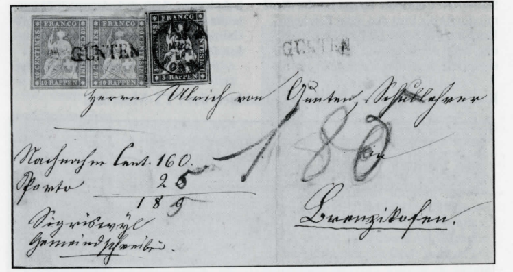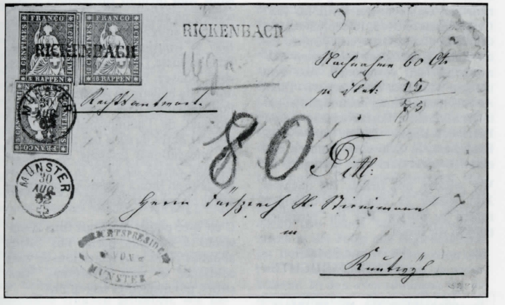 Abb. 3: Brief von Rickenbach (LU) nach Ermensee, nachtaxiert in Münster (dem heutigen Beromünster), Entwertung der (leider schlecht geschnittenen) Strubelis mit dem g rosse n Zierstempel.