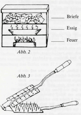 Art. 27 beschreibt den Vorgang des Desinfizierens in einem dreigeteilten Kasten (Abb. 2), unten Feuer, in der Mitte eine Essigschale, oben die Briefe auf einem Rost. Auf dem Feuer ein Räucherpulver gestreut. Die Briefe blieben 5 Minuten im Kasten (äussere Reinigung), wurden herausgenommen und durchstochen mit Pfriem (oder mit Rastelzange, Abb. 3), oft auch zur Seite aufgeschnitten und wieder 5 Minuten in den Kasten gelegt (innere Reinigung), wobei Hitze, Essigdampfund Rauchpulver einwirkten.
