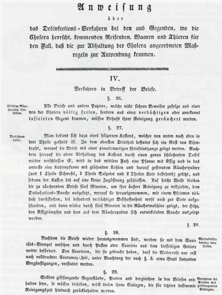 Schon am 4.5.1831 brachte ein Edikt der Königlichen Preussischen Regierung Instruktionen zur Behandlung der Korrespondenz: «Alle Briefe mussten durchstochen worden mit Pfrieme oder Nadeln, in Essig getaucht und geräuchert in Spezialkasten».
