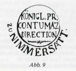 Der Stempel vom Typ II ist komplett abgeschlagen auf vorausbezahltem Brief von Libau, mit zweisprachigem Aufgabestempel vom 19. Mai, über Laugallen (Sanitätsstempel) und Memel (1. Juni) mit Einzeiler FRANCO von Emmerich und Franco Tout, roter Kastenstempel von Arnhem, nach Schiedam (Niederlande), durchstochen und mit leichten Essigspuren (Abb. 8, Seite 8). Die Seltenheit der beiden Negativstempel von Laugallen lässt sich erklären durch den anscheinenden Wechsel der Reinigungsstätte. Vom 18. Mai bis 8. Juni (nur 22 Tage!) finden wir beide Stempel mit dem Memeler Durchgangsstempel. Abgelöst werden sie durch zwei neue Stempel in einer anderen Kontumaz-Anstalt: Nimmersatt, und zwar vom 15.6. bis 23.10.1831 (immerhin ca. vier Monate). Es gibt zwei Typen mit gleicher Inschrift: Kreisstempel mit Dreizeiler KÖNIGL. PR. CONTUMAZ DIRECTION mit Aussenrand: zu NIMMERSATT (untere Hälfte). Im Gegensatz zu Laugallen, immer rückseitig gestempelt, (Abb. 9 + 10).