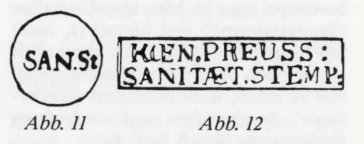 Berlin, Zentralamt für Post aus Polen und Russland, Kastenstempel mit zweizeiliger Inschrift: KOEN.PREUSS: SANITAET. STEMP:, in 3 Typen vom 3.7. bis 16.9.1831. Davon nur eine Type auf 2 Briefen von Warschau nach Paris, 30.7. und 4.8.1831 (Abb. 12).
