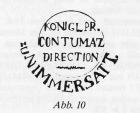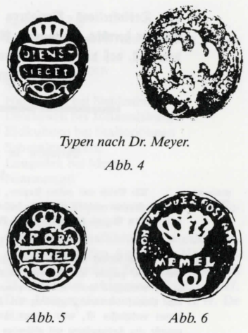 Bei den in Laugallen (Memel) verwendeten Sanitätsstempeln (siehe Art. 28 der Instruktion vom 13. Juni) handelt es sich um Petschaften des Memeler Oberpostamtes. Dr. Meyer beschreibt in seinem grossartigen Werk (Disinfected Mail» beide Stempel als undeutlich: 1) Ovalstempel, weisse Krone mit Inschrift DIENST-SIEGEL in 2 Zeilen, 22 x 20 mm; 2) Ovalstempel weisser Adler, 25 \4 mm (Abb. 4