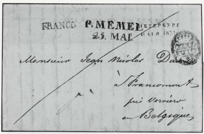 Abb. 7: Vorausbezahlter Brief von St. Petersburg 9.5.1831, über Laugallen, Memelund Aachen nach Verviers (Belgien).