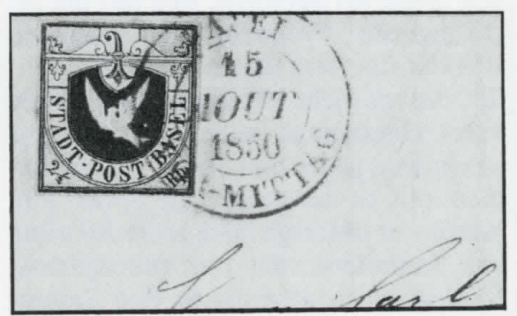 Am 26. Dez. 1843 beschloss die Postkommission von Basel: «.. diese Francozettelchen sind beym Postamte 20 stückweise (also für 5 Batzen) abzugeben» (Abele, SBZ 1945/6-7). Mit «Francozettelchen» waren die Dybli gemeint. Und am 29. Jan. 1845 liess Melchior Berri (1801-54), der Entwerfer der Dybli, den Dybli-Drucker Job. Benjamin Krebs (1795-185?) in Frankfurt a/M wissen: «Das Zeichen erhält einen Werth von 2!/2 Rappen oder l Kreutzer».