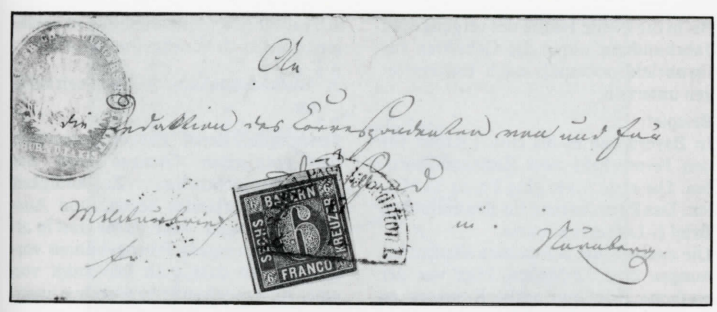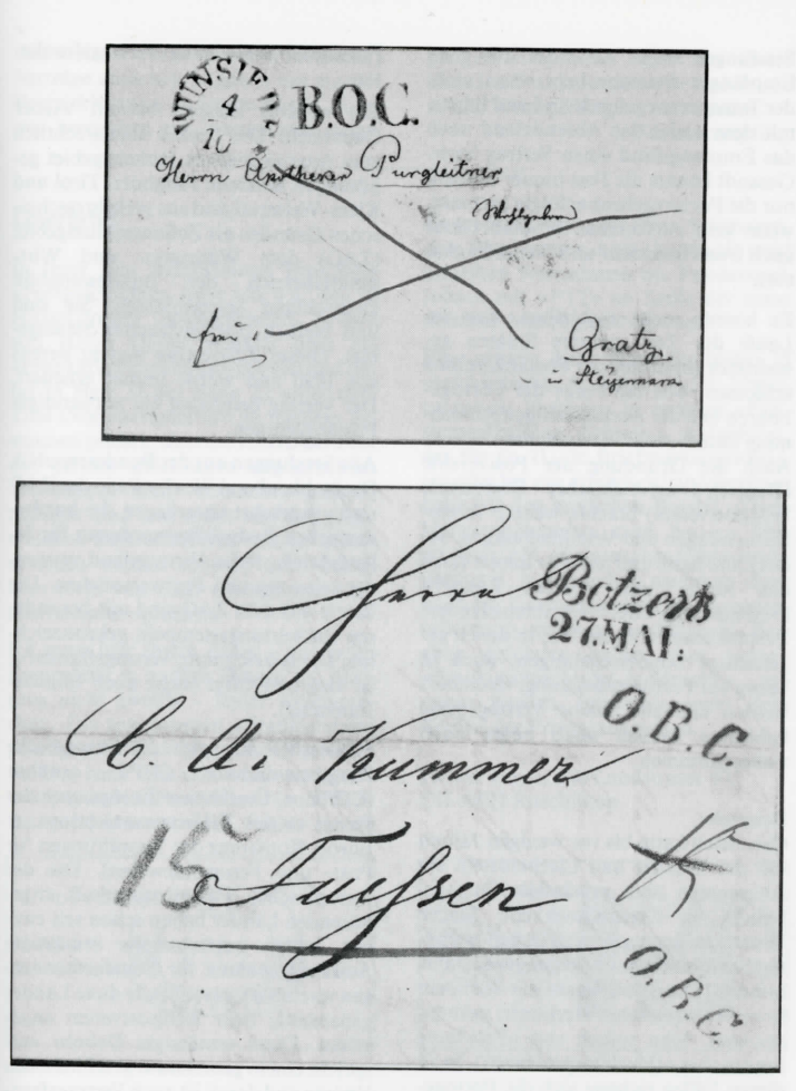 Vertragsfrankaturen: Der bayerische Stempel B.O.C. besagt, dass die gegenseitige Portaufrechnung nach einem zwischen Bayern und Österreich ausgehandelten Vertrag erfolgt. Der österreichische Stempel dazu lautet O.B.C