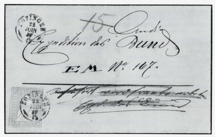 Im Jahre 1857 kostete ein Brief der untersten Gewichtsklasse (bis '/z Loth = 7,8g) von Zofingen nach Bern 15 Rappen (3. Briefkreis: über 10 Wegstunden). Dieses Porto galt sowohl für frankierte wie für unfrankierte Sendung