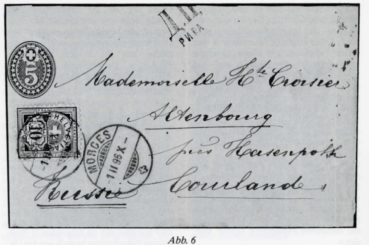 verstiessen, als unzustellbar angesehen und zurückgesandt. Sie erhielten einen Kleber mit russischem und französischem Text «Von der Zensur zurückgewiesen» (s. Abb. 7), oder wurden ganz einfach konfisziert, wie die Abb. 8 zeigt. Dieser Stempel befindet sich auf einem Streifband aus Jerusalem aus dem Jahre 1888 und hat folgenden Wortlaut: BLOJENIE KONFISKOVANO / V.Z.K. (Ausmasse 14:46 mm).