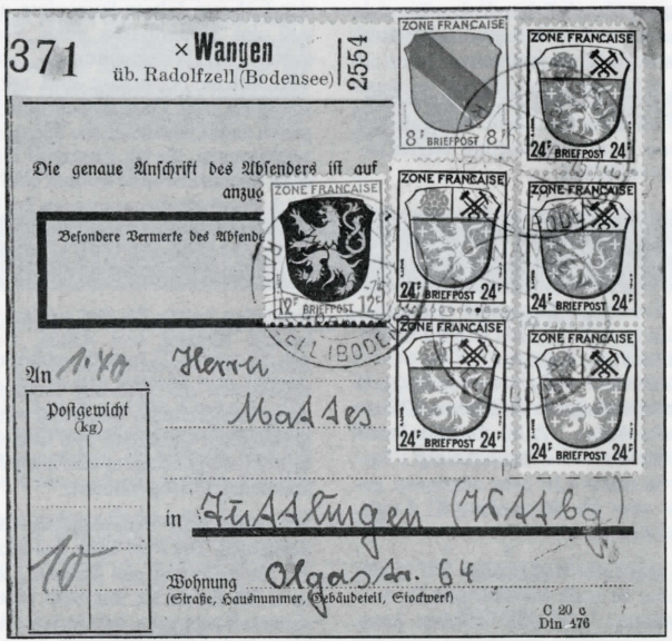 Formularfrankatur (Paketkartenfrankatur): Die Paketkarte ist ein genormtes Postformular. Es dient als Versendeunterlagefür Postpakete. Die darauf erbrachte Frankatur ist die Paketbeförderungsgebühr. Buntfrankatur: Die Gebühr wurde mit mehreren Marken einer Ausgabe erbracht. Mehrfarbenfrankatur: Die verwendeten Marken sind in den Farben unterschiedlich und es wurden (wenigstens) drei Marken verwendet. Besondere Anmerkung: Bei Paketkarten (aber auch bei anderen Sendungen) kommt es vor, dassein Teil der Postwertzeichen rückseitig angebracht ist. Bei der Frankaturbezeichnung sind alle (vorderseitig oder rückseitig angebracht) Postwertzeichen oder Barzahlungsvermerke einzubeziehen.