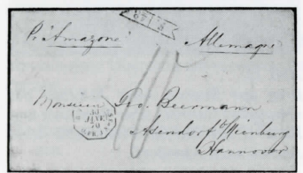 Abb. 13: Brief von Buenos Aires 28.1.1870 mit Paquebot «Amazone» über Bordeaux, Paris (F. 48) und Aachen nach Asendorf
