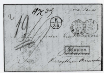 Abb. 9: Brief von Malaga (Spanien) nach Braunschweig, 10.10.1858 über Paris, dort mit «F/36» gestempelt, weiter über Aachen mit rotem Rl «Spanien» versehen
