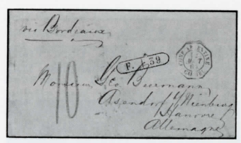 Abb. 12: Brief aus Buenos Aires 10.8.1865 per «Paguebot Carmel» über Bordeaux und Paris (F.39) Transit Frankreich, über Aachen nach Asendorf